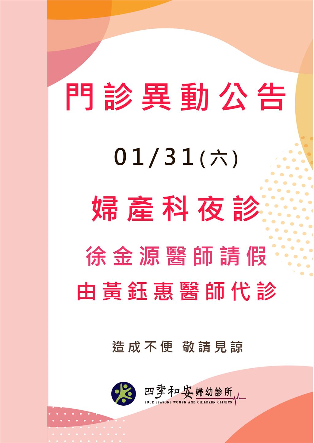 01/31(六)婦產科門診異動